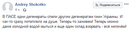 "В ПАСЕ одни дегенераты спели другим дегенератам гимн Украины. И как-то сразу потеплело на душе. Теперь-то заживем! Теперь можно даже холодной водой мыться и еще один склад взорвать - всё нипочём!" - написал пользователь Андрей Шокотко.