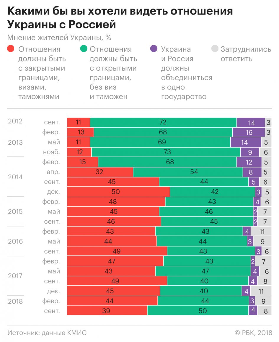По данным сентябрьского исследования, 48% украинских респондентов на вопрос "Как вы в целом относитесь сейчас к России?" ответили, что относятся положительно. Из них 38% сказали "в основном хорошо", 10% - "очень хорошо". Это значительно больше, чем годом ранее (37%). В сентябре 2017 года 30% опрошенных охарактеризовали свое отношение к России как "в основном хорошее", 7% — как "очень хорошее".