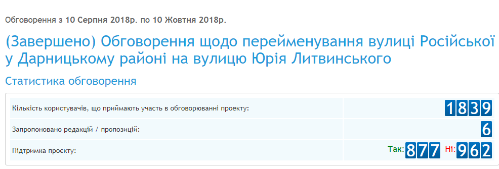 Также не было поддержано переименование улицы Российской в Дарницком районе в улицу Юрия Литвинского. Голоса за переименование отдали 877 человек, а "нет" сказали 962 человека.