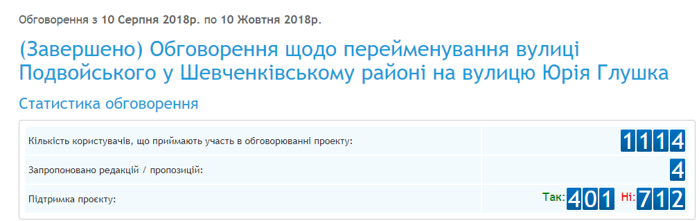 Также не поддержана была инициатива о переименовании улицы Подвойского в Шевченковском районе в улицу Юрия Глушко. Против выступило почти в два раза больше людей, чем за. Да: 401 Нет: 712.
