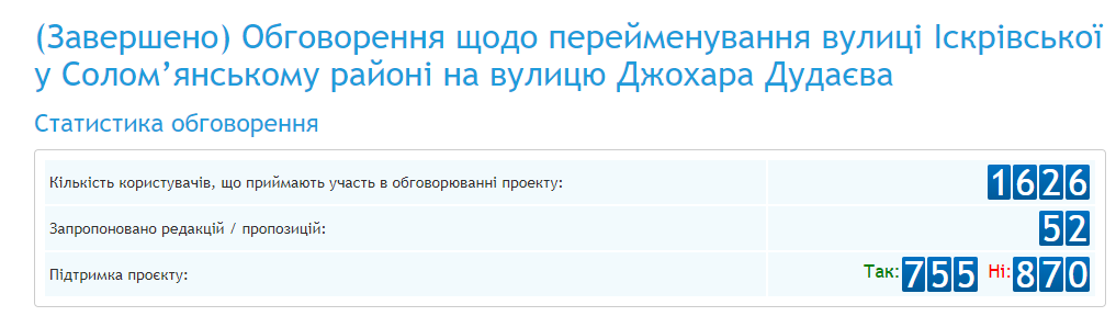 Не будет в Киеве и улицы Джохара Дудаева. Улица Искровская (названная в честь первой газеты большевиков "Искра") не будет переименована. Да проекту сказали 755 человек, а нет - 870.