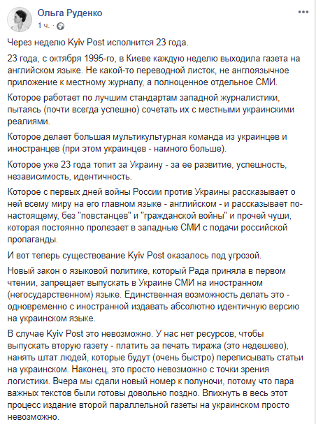 Новый языковой закон, принятый в первом чтении на заседании Верховной Рады 4 октября, ставит под угрозу существование единственного полноценного отдельного англоязычного СМИ в Украине. Об этом пишет заместитель редактора Kyiv Post Ольга Руденко на своей странице в Facebook.