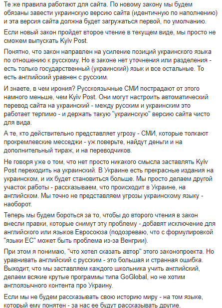 Такие же правила не позволят функционировать сайту Kyiv Post. "Понятно, что закон направлен на усиление позиций украинского языка по отношению к русскому. Но в законе нет уточнения или разделения - есть только государственный (украинский) язык и все остальные. То есть английский уравнен с русским", - отмечает замредактора Kyiv Post.