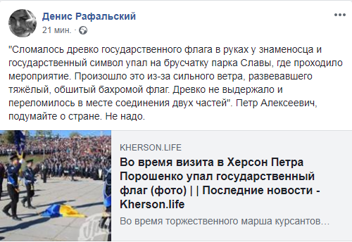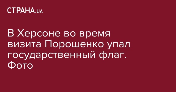 В субботу, 13 октября, во время визита Петра Порошенко в Херсон, в ходе торжественного мероприятия, в котором принял участие президент, упал государственный флаг. Об этом сообщил журналист Денис Рафальский на своей странице в Facebook.