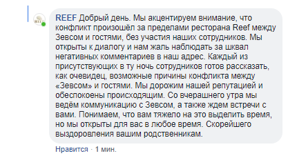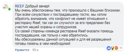 В комментариях к посту с заявлением выступили и представители ресторана. По информации REEF, конфликт к заведению отношения не имеет, он случился за его пределами и без участия охраны и сотрудников. Также сотрудники ресторана могут как очевидцы рассказать о конфликте между гостями и представителями "Зевса", а сам REEF готов оказать помощь семье пострадавшего.