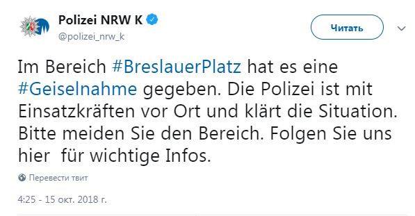 В центре Кельна (ФРГ) сегодня, 15 октября, произошел захват заложников  на железнодорожном вокзале, пишет местная полиция в Twitter. Полиция обезвредила преступника.