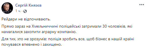 "Опять рейдеры сельскохозяйственного предприятия. "Сварог", что в Шепетовке Хмельницкой области. Приехали 25 умников на "гастроли" за 60 долларов в день, захватили предприятие. Все сразу задержаны полицией и ближайшие дни проведут в тюрьме", - отметил министр внутренних дел.