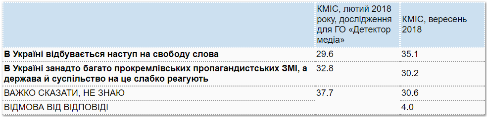 Таким образом число людей, которые считают, что в Украине идет наступление на свободу слова превысило число людей, которые склонны оправдывать нападки на СМИ их якобы "прокремлевской" направленностью.