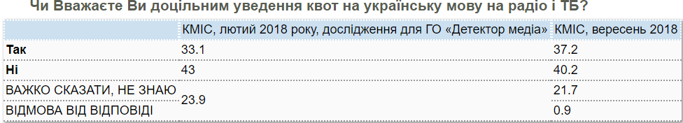 Языковые квоты на радио и ТВ поддерживают 37% украинцев. Против - 40%. Количество сторонников квот с зимы выросло, а противников - упало. Тем не менее, перевес пока на стороне тех, кто не согласен с украинизацией эфира.