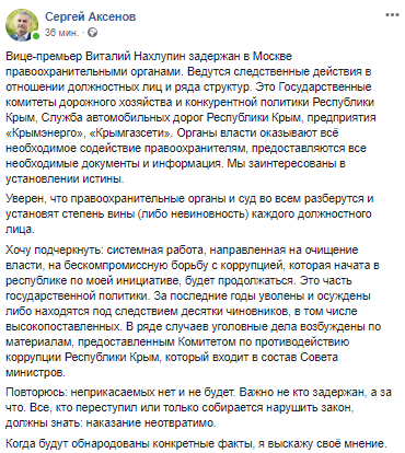 "Это Государственные комитеты дорожного хозяйства и конкурентной политики Республики Крым, Служба автомобильных дорог Республики Крым, предприятия "Крымэнерго", "Крымгазсети". Органы власти оказывают все необходимое содействие правоохранителям, предоставляются все необходимые документы и информация. Мы заинтересованы в установлении истины", - пишет Аксенов.