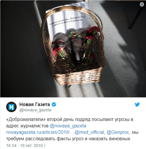 В четверг, 18 октября, к зданию, в котором находится редакция российской "Новой газеты" подбросили корзину с отрезанной головой барана. Днем ранее туда принесли похоронный венок. В заявлении редакции "Новой газеты" расценили оба "подарка" как угрозы в адрес журналиста издания Дениса Короткова.