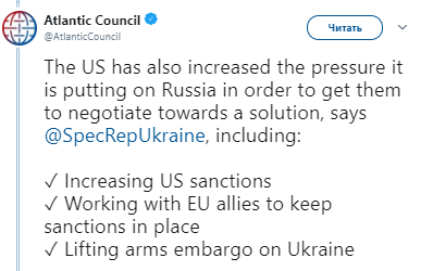 Также во время выступления спецпредставитель США заявил, что администрация президента Трампа продолжит усиливать давление на Россию, в первую очередь путем введения новых санкций с периодичностью месяц или два