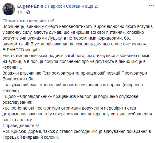 "Преступник, виновный в смерти несовершеннолетнего, приговор в отношении которого вступил в законную силу, пожалуй думал, что "решил все свои вопросы", спокойно разгуливая по улицам Луцке, а не тюремными коридорами, потому что – вдумайтесь! – в учреждении исполнения наказаний для него "не хватило" свободного места", – написал Енин.
