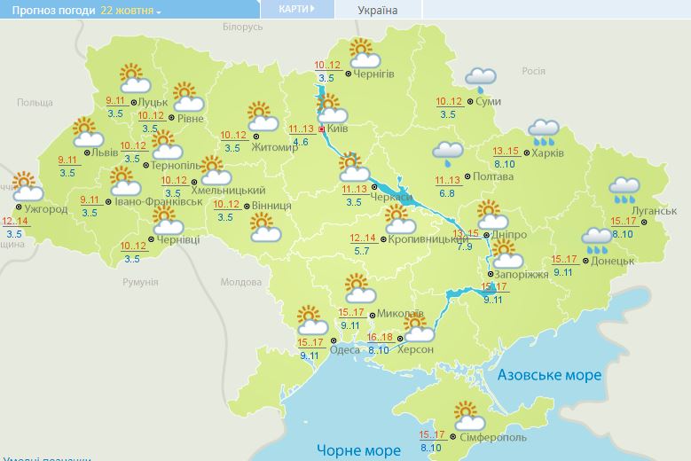 24-25 октября в Украине временами небольшой дождь, в южных, восточных областях и Карпатах местами умеренный дождь, в западной, 25 октября, в северной части страны местами с мокрым снегом. Температура ночью 3-9 градусов, на побережье морей до 11 градусов тепла. 25 октября ночью в западных и северных областях от 5 градусов тепла до 1 градуса мороза; днем 5-11 градусов. 24 октября в южных, восточных и большинстве центральных областей 11-17 градусов.