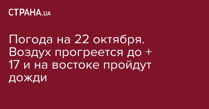 В понедельник, 22 октября, в Украине ожидается преимущественно сухая и теплая погода, только на востоке страны пройдут дожди, но воздух прогреется до +17 градусов. Об этом сообщается на сайте "Укргидрометцентра".