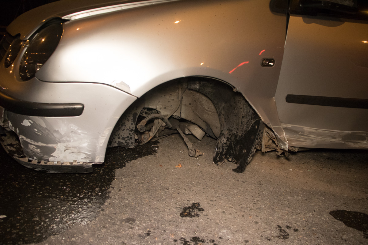 Инцидент произошел около 00:30. Водитель автомобиля Volkswagen Polo, который ехал по проспекту в сторону улицы Зодчих, не справился с управлением и влетел в отбойник. В аварии никто не пострадал, у авто отлетело переднее колесо и вытекло масло.