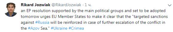 В четверг Европарламент готовится принять жесткую резолюцию, в которой призовет государства ЕС усилить санкции против России, если ситуация в Азовском море обострится. Об этом в своем Twitter сообщил брюссельский корреспондент "Радио Свобода" Рикард Йозвяк.