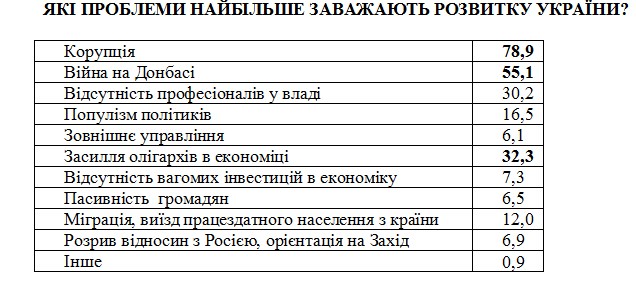 Отвечая на вопрос, что же мешает Украине развиваться, подавляющее большинство ответили - "коррупция": 79% населения. Война на Донбассе собрала почти на 25% меньше голосов (55%). Третьим по популярности ответом было олигархическое засилье в экономике (32%).