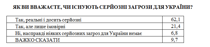 Так, 62% респондентов ответили, что для Украины существуют серьезные угрозы. Называя их, большинство опрошенных выделили экономический кризис, бедность, обесценивание гривны и захват территории страны со стороны РФ.
