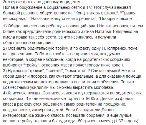 Так, председатель родительского комитета школы Михаил Мусатов на своей странице в Facebook так описывает инцидент: "Родительская тройка 6-Б класса, в последний учебный день четверти решила поздравить детей и накрыть им сладкий стол... В классе 32 ребенка, но так уж сложилось, что родители одной девочки, Дианы Андроновой, не согласны со сбором средств на классные нужды и принципиально в нем не участвуют. Раздавая сладости, представитель тройки Наталья Толяренко сказала Диане, что не может ее угостить, т.к. продукты куплены на средства других родителей. Диана расстроилась, начала плакать, одноклассники интересовались - что случилось? На что Толяренко повторила причину, по которой не может угостить Диану. Никто из одноклассников не злорадствовал, не издевался, дети сидевшие рядом, скорее были в недоумении от произошедшего. Классный руководитель Наталья Викторовна Комир, в это время выходила из класса".
