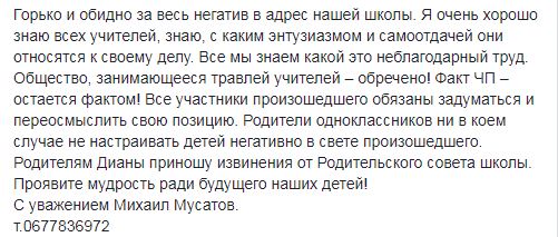 Он отмечает, что в итоге инцидента классный руководитель отстранена от должности, директору грозят оргвыводы, а "на педагогический коллектив вылиты реки грязи в интернете". "Общество, занимающееся травлей учителей - обречено! Факт ЧП - остается фактом! Все участники произошедшего обязаны задуматься и переосмыслить свою позицию. Родители одноклассников ни в коем случае не настраивать детей негативно в свете произошедшего. Родителям Дианы приношу извинения от Родительского совета школы. Проявите мудрость ради будущего наших детей!", - подытожил Мусатов.