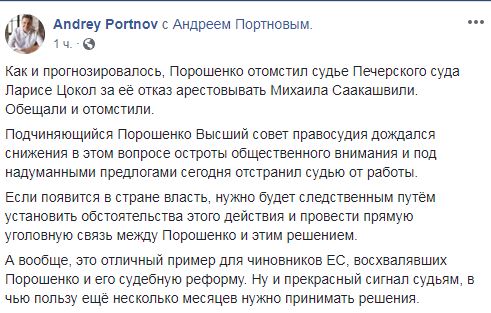 Юрист Андрей Портнов считает, что президент Петр Порошенко отомстил Цокол за ее отказ арестовывать Михаила Саакашвили. "Обещали и отомстили. Подчиняющийся Порошенко Высший совет правосудия дождался снижения в этом вопросе остроты общественного внимания и под надуманными предлогами сегодня отстранил судью от работы", - отметил он в Facebook.