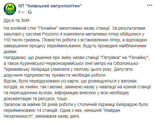 Также мы писали, что в феврале Киеврада переименовала станцию метро "Петровка" на "Почайна".
