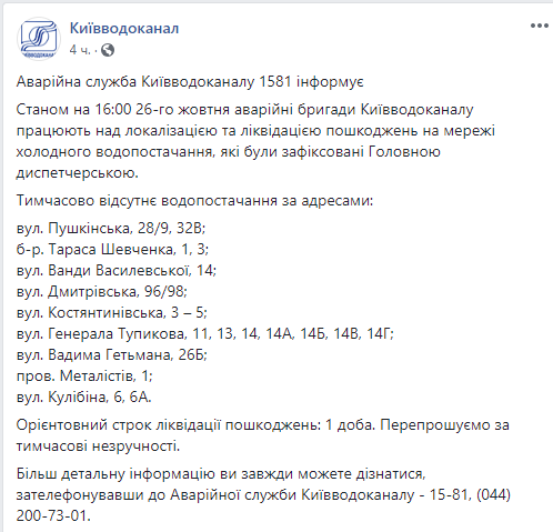 "По состоянию на 16:00 26 октября аварийные бригады Киевводоканала работают над локализацией и ликвидацией повреждений на сети холодного водоснабжения, которые были зафиксированы Главной диспетчерской", - сказано в сообщении.