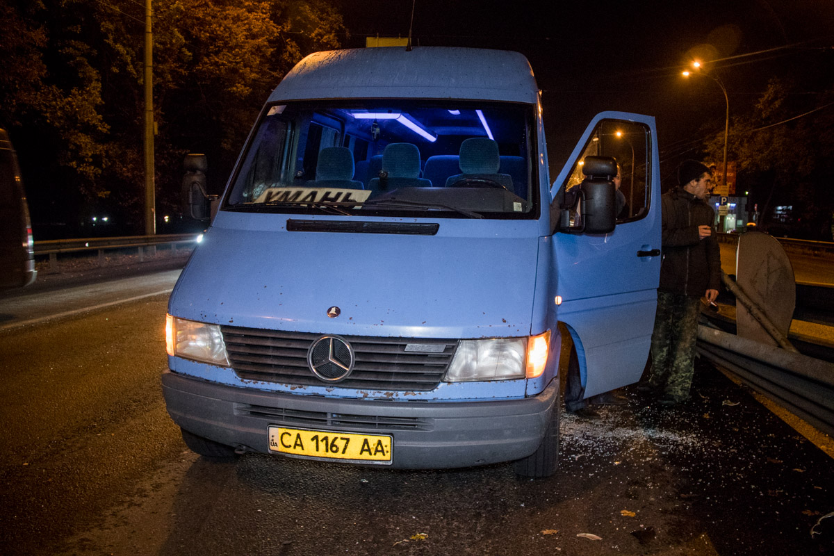 Авария произошла вечером 26 октября на Одесской трассе на въезде в столицу. Очевидцы ДТП сообщают, что женщина-водитель с пассажиром на внедорожнике Hyundai Terracan на большой скорости ехали по Одесской трассе в сторону Киева. Возле КПП при въезде в столицу Hyundai влетел в стоящую на светофоре Toyota Corolla. От удара внедорожник занесло, он врезался в отбойник, который зацепил маршрутку "Киев — Умань с пассажирами в салоне.