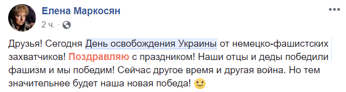 "Друзья! Сегодня День освобождения Украины от немецко-фашистских захватчиков! Поздравляю с праздником! Наши отцы и деды победили фашизм и мы победим! Сейчас другое время и другая война. Но тем значительнее будет наша новая победа!"