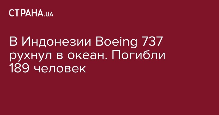 "Было подтверждено, что самолет потерпел крушение", - сказал источник в экстренной службе. По его словам, с буксира, выходящего из порта Джакарты, видели, как лайнер падал в море. По информации мониторинговой службы Flightradar24, рейс из Джакарты в Панкалпинанг выполнял Boeing 737 MAX 8. По последним данным, на борту находились 189 человек, в том числе 7 членов экипажа.