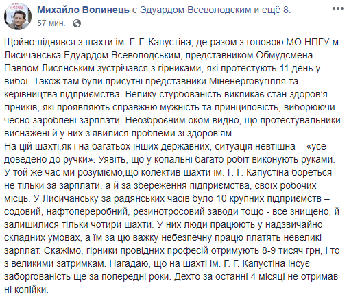 Горняки шахты им. Капустина требуют вернуть им долги по заработной плате, которые, по словам Волынца, достигают 170 миллионов гривен.