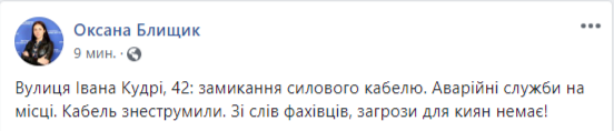 "Улица Ивана Кудри, 42: замыкание силового кабеля. Аварийные службы на месте. Кабель обесточили. По словам специалистов, угрозы для киевлян нет", - написала сотрудница пресс-службы Оксан Блищик в Facebook.