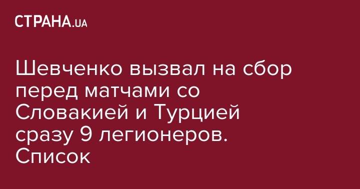 Главный тренер сборной Украины Андрей Шевченко вызвал 9 игроков из зарубежных клубов на матчи со Словакией и Турцией. Об этом сообщает пресс-служба ФФУ.