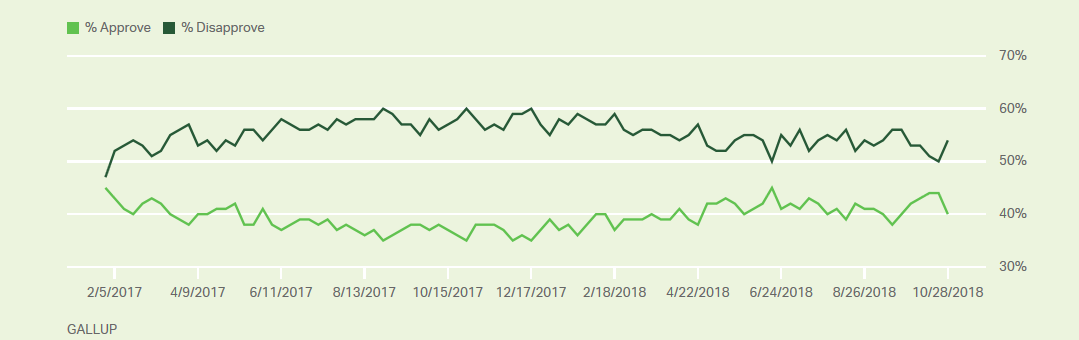Согласно итоговым данным соцопроса Gallup, сейчас американского лидера поддерживают около 40% жителей США, что на четыре процента меньше, чем аналогичный показатель, зафиксированный 21 октября. При этом негативно о его работе высказались 54% опрошенных.