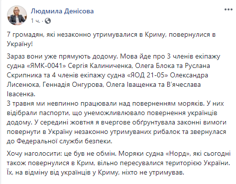 "Хочу подчеркнуть: это был не обмен. Моряки судна "Норд", которые сегодня также вернулись в Крым, свободно передвигались по территории Украины. Их, в отличие от украинцев в Крыму, никто не удерживал", - написала украинский омбудсмен на своей странице в Facebook.
