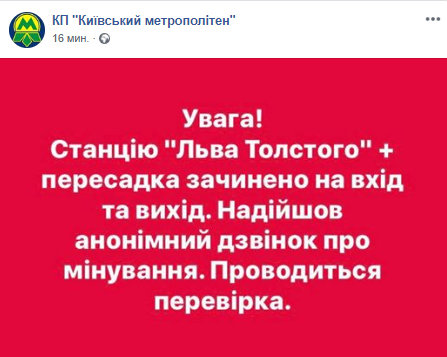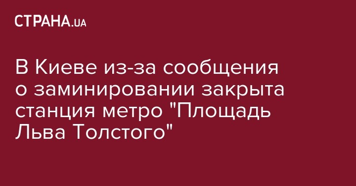 В Киеве закрыта на вход и выход станция метро "Льва Толстого". Это произошло  после поступления сообщения о заминировании. Об этом сообщает пресс-служба столичной подземки на своей странице в Facebook.