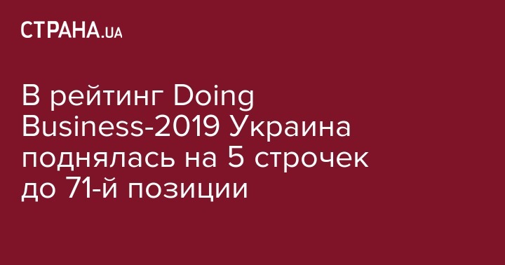 Украина поднялась еще на 5 позиций в мировом рейтинге легкости ведения бизнеса Doing Business 2019 Всемирного банка (ВБ) и заняла 71 место среди 190 стран. Об этом сообщил президент Украины Петр Порошенко а своей странице в Facebook в среду.