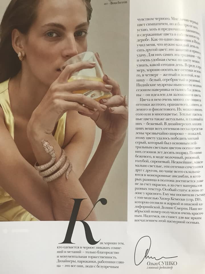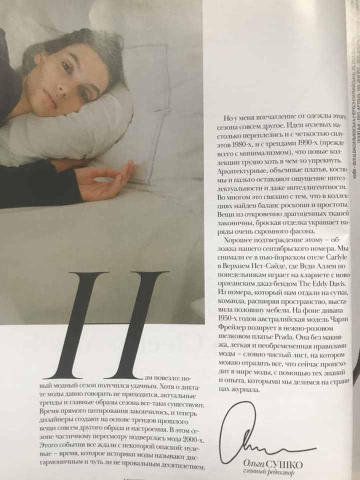 Но на днях в Сети разгорелся скандал – главного редактора журнала обвинили в плагиате. Как стало известно, колонки Ольги Сушко стали точными копиями материалов российского журнала Harper’s Bazaar многолетней давности.