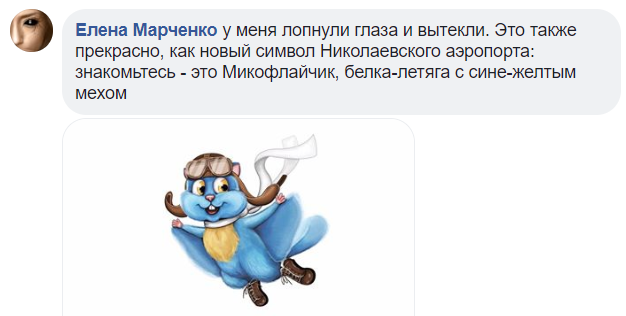 "У меня лопнули глаза и вытекли. Это также прекрасно, как новый символ Николаевского аэропорта: знакомьтесь - это Микофлайчик, белка-летяга с сине-желтым мехом", - пишет журналистка Елена Марченко.