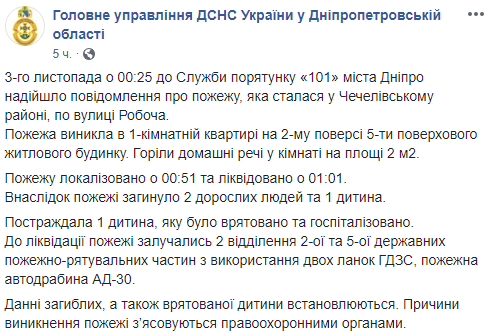Сегодня, 3 ноября, в Днепре во время пожара в пятиэтажном доме погибли 3 человека. Об этом сообщает пресс-служба ГосЧС Украины в Днепропетровской области.