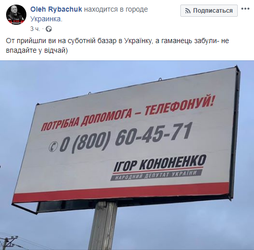 На рекламном щите, который был запечатлен в городе Украинка, красуется надпись: "Нужна помощь - звони!". Ниже размещены номер телефона, а также подпись - нардеп Игорь Кононенко. Правда, номер начинается с цифр 0800, так что, очевидно, это не личный номер влиятельного политика.