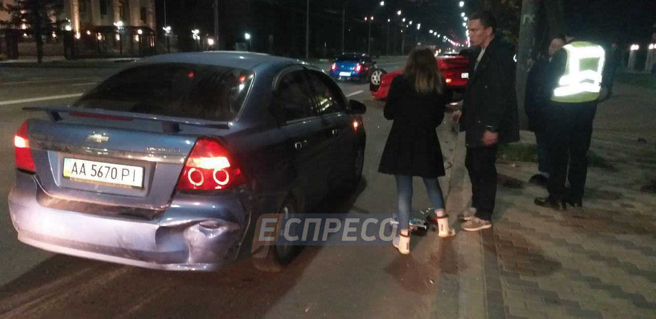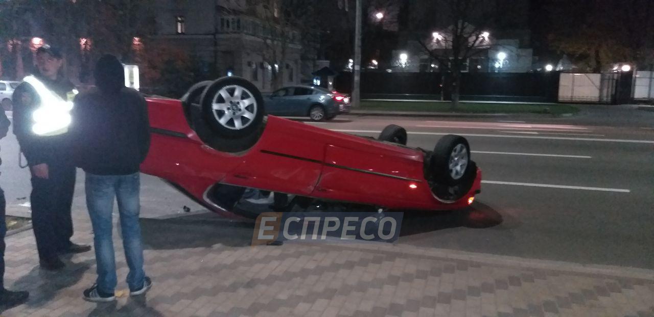 На Воздухофлотском проспекте Киева, напротив посольства России, произошло ДТП. После столкновения двух легковушек одна из перевернулась и стала вверх колесами.