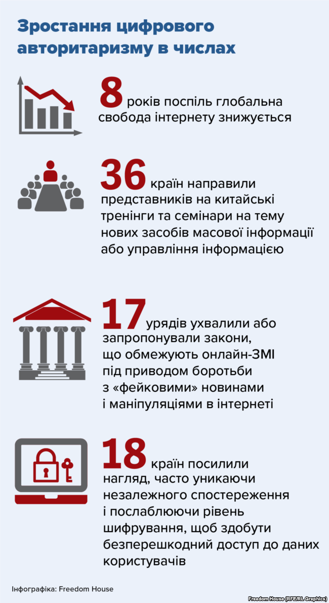 Мировые государства усиливают контроль цифрового авторитаризма, прикрываясь лозунгами о "борьбе с фейковой информацией" и лишая своих граждан доступа к Интернету. К такому выводу пришла американская неправительственная организация Freedom House в своем ежегодном отчете. Об этом сообщает "Радио Свобода".