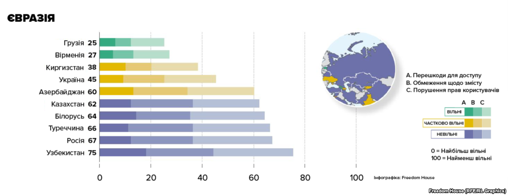 "Украина стремилась защитить свободу интернета на фоне конфликта с поддерживаемыми Россией сепаратистами и информационной войны с Кремлем. В 2017 году президент Петр Порошенко из соображений безопасности заблокировал несколько распространенных российских интернет-платформ; некоторые пользователи социальных медиа предстали перед судом за высказывания, которые были оценены как "призывы к экстремизму и сепаратизму". Жители оккупированных территорий имели проблемы с доступом к интернету, а журналисты подвергались техническим атакам через интернет и физическому насилию с обеих сторон конфликта", - говорится в отчете Freedom House "Свобода в интернете-2018".