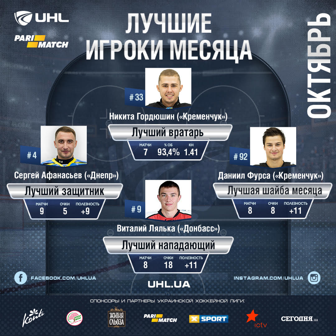 В октябре лучшим вратарем Украинской хоккейной лиги стал игрок "Кременчуга" Никита Гордюшин. Об этом информирует пресс-служба УХЛ.