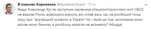 Вице-премьер-министр Украины Вячеслав Кириленко заявил, что экс-заместитель председателя Специальной мониторинговой миссии в Украине Александр Хуг все время на посту поддерживал российскую точку зрения о конфликте на Донбассе. Об этом он написал 5 ноября в Twitter.
