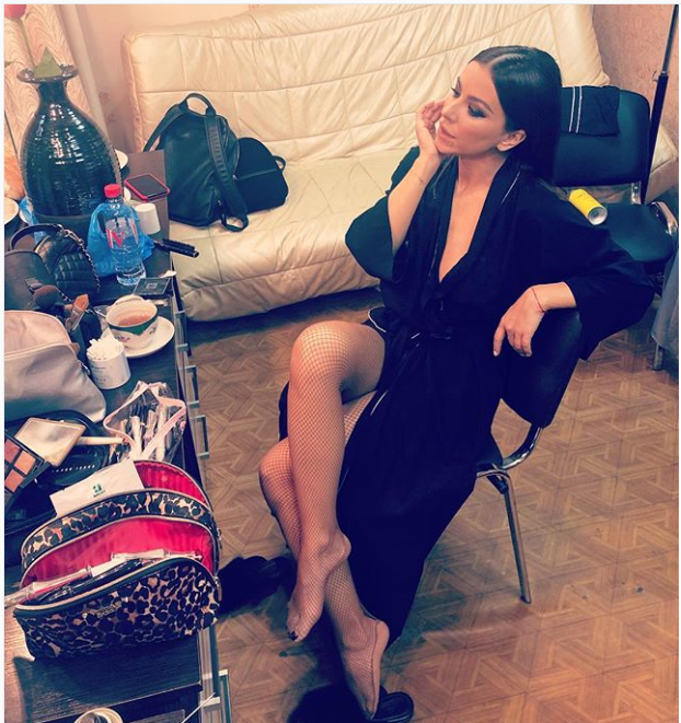 Украинская певица Ани Лорак опубликовала новое фото, сделанное скорее всего в ее же гримерке. На появившемся в Instagram снимке артистка предстала в черном халате и сетчатых колготках на фоне сумок, чашек, косметики.
