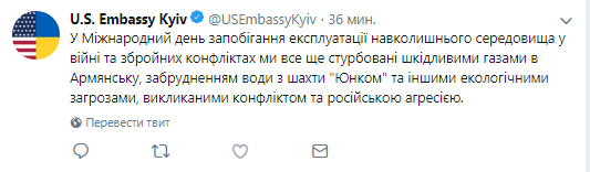 "В Международный день предотвращения эксплуатации окружающей среды в войне и вооруженных конфликтах мы все еще обеспокоены вредными газами в Армянске, загрязнением воды из шахты "Юнком" и другими экологическими угрозами, вызванными конфликтом и российской агрессией", - сказано в заявлении.