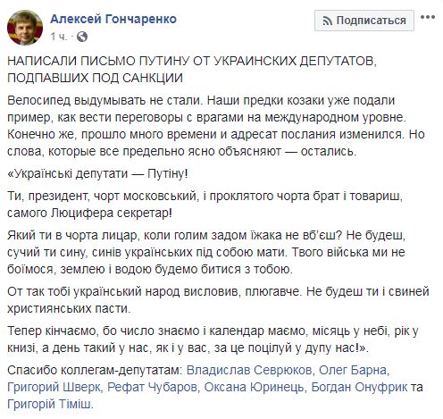 "Українські депутати – Путіну! Ти, президент, чорт московський і проклятого чорта брат і товариш, самого Люцифера секретар! Який ти в чорта лицар, коли голим задом їжака не вб’єш? Не будеш, сучий ти сину, синів українських під собою мати. Твого війська ми не боїмося, землею і водою будемо битися з тобою. От так тобі український народ висловив, плюгавче. Не будеш ти і свиней християнських пасти. Тепер кінчаємо, бо число знаємо і календар маємо, місяць у небі, рік у книзі, а день такий у нас, як і у вас, за це поцілуй у дупу нас!" – сказано в письме.